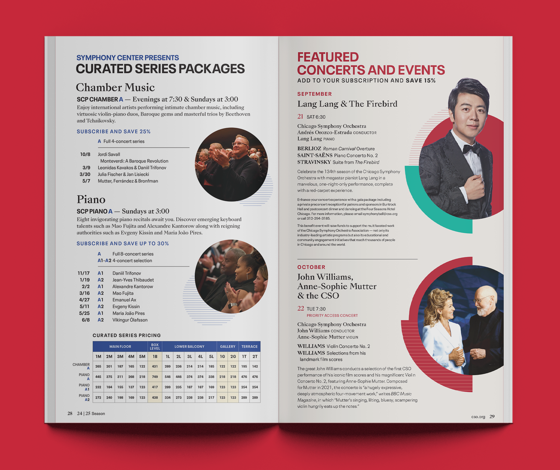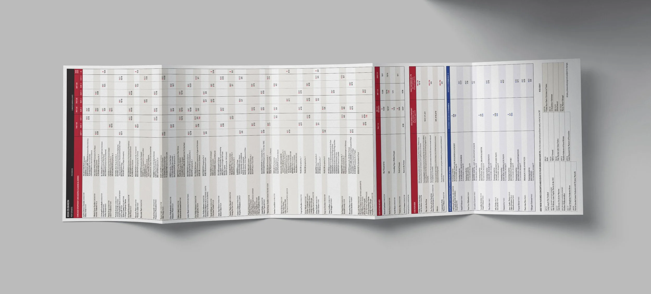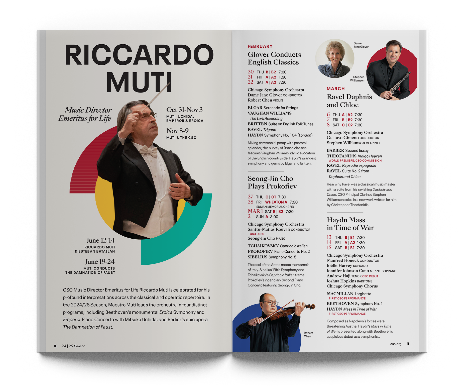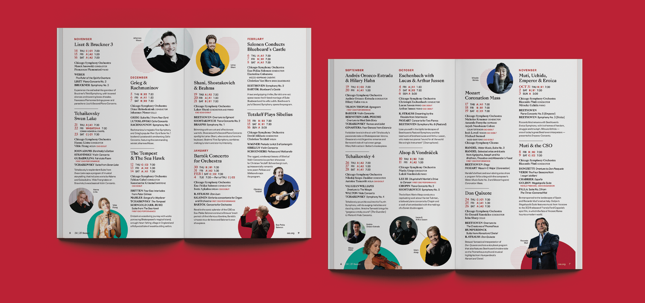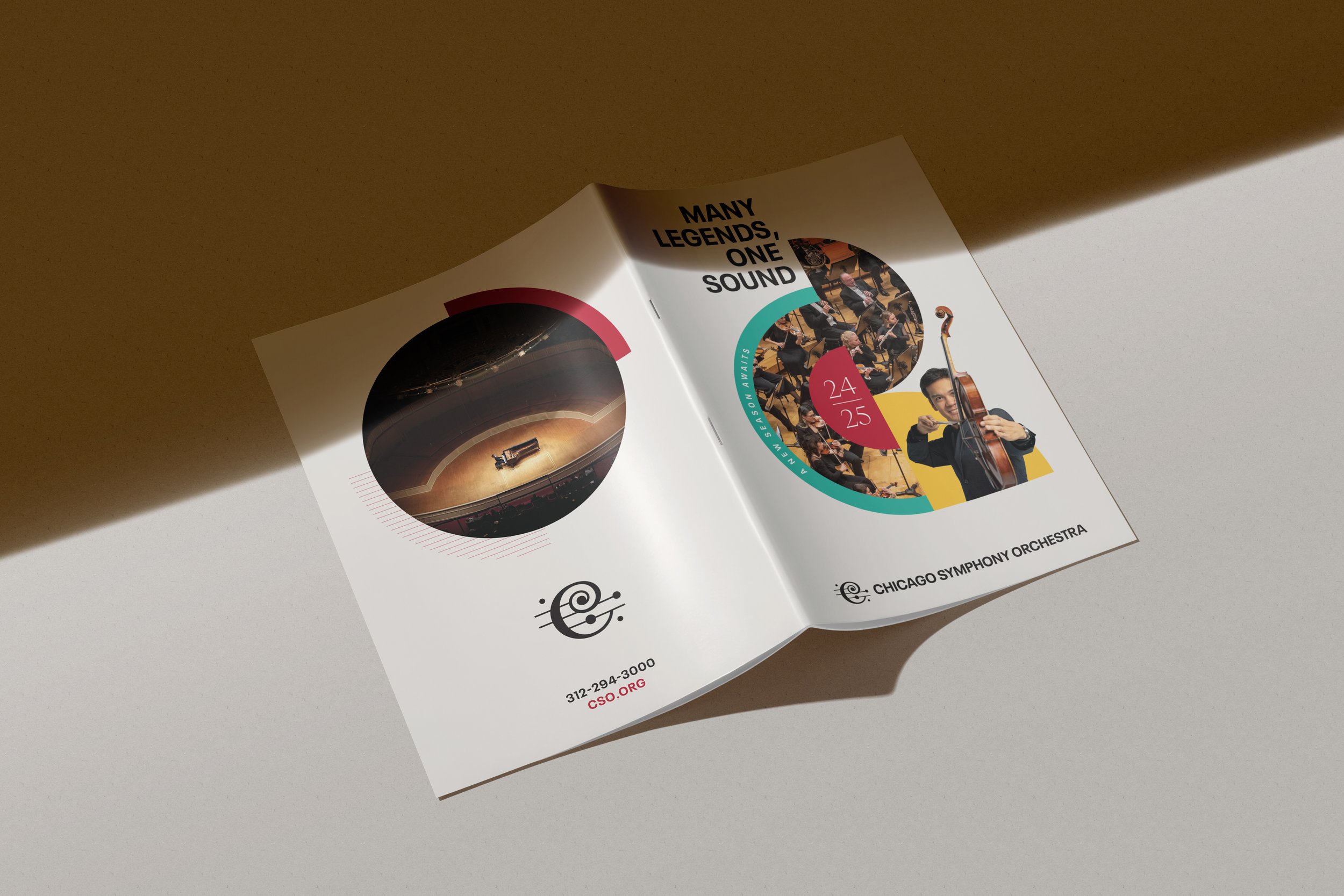 The Chicago Symphony Orchestra has been one of the greatest orchestras in the world for many decades. I worked alongside the team at the CSO to bring to life their 2024/25 season catalog, which brings in millions of dollars in ticket sales and guides the user through the journey of being a subscriber. Here, the catalog housed an extensive catalog and vision for the listener's journey through the season. This catalog also adopted the creative direction that had been recently established, embodying movement and musical elements through circular shapes and lines relative to and highlighting the performers themselves through imagery.